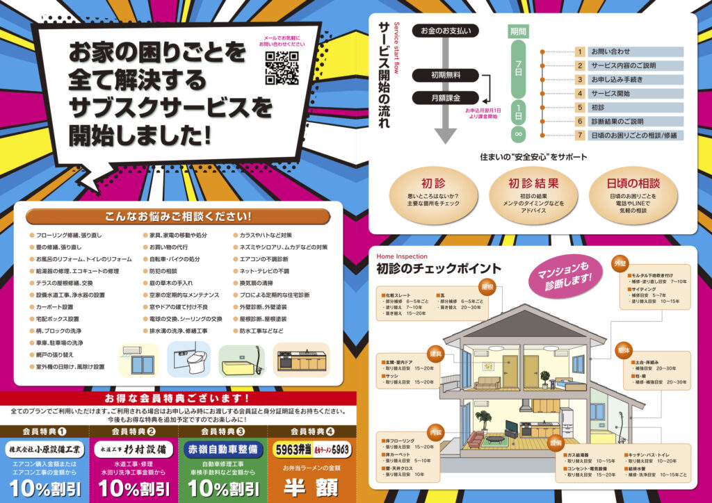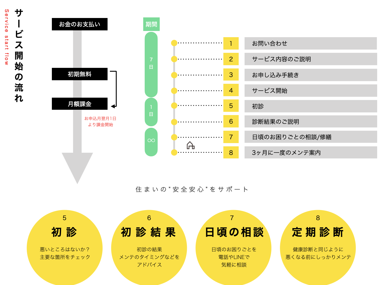 毎回修繕の依頼をするよりもお得に修繕可能。1度の作業で5,000円以上かかる作業も(フローリング修繕、壁紙修繕、建て付け修繕、雨どい修繕など)月額1,900円〜でまるっと解決!